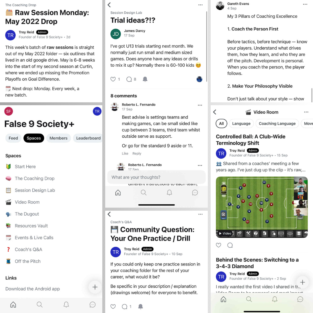 False 9 Society+ is a private space where coaches share sessions, trade ideas, and grow together — one week at a time.